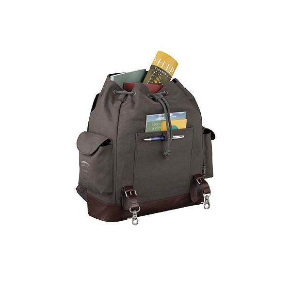 Backpack. Exclusive design backpack with open main compartment with pull-cord closure. Protective flap closes with distressed silver clasped hardware. Open front pocket with pen loop. Fold over side pockets with Velcro? closures. Adjustable backpack straps and carrying handle. Unique Field & Co.? vintage branding elements and hardware. Canvas 18 oz. Cotton and imitation leather. 575.