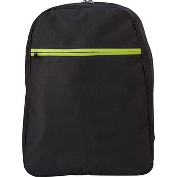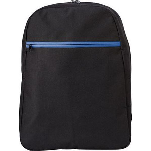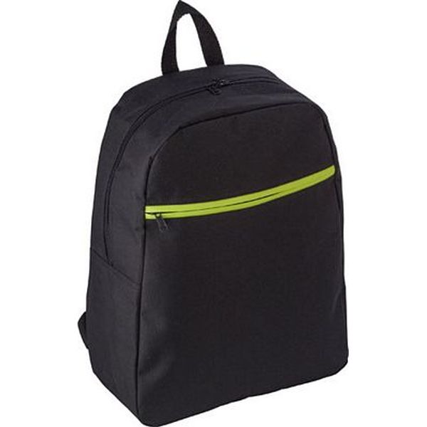 Backpack in a 600D polyester material with a front zipped pocket and adjustable shoulder straps.