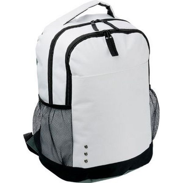Backpack in a 600d polyester material with a main compartment, one zipped and one open front pocket, two mesh side pockets and adjustable shoulder straps.