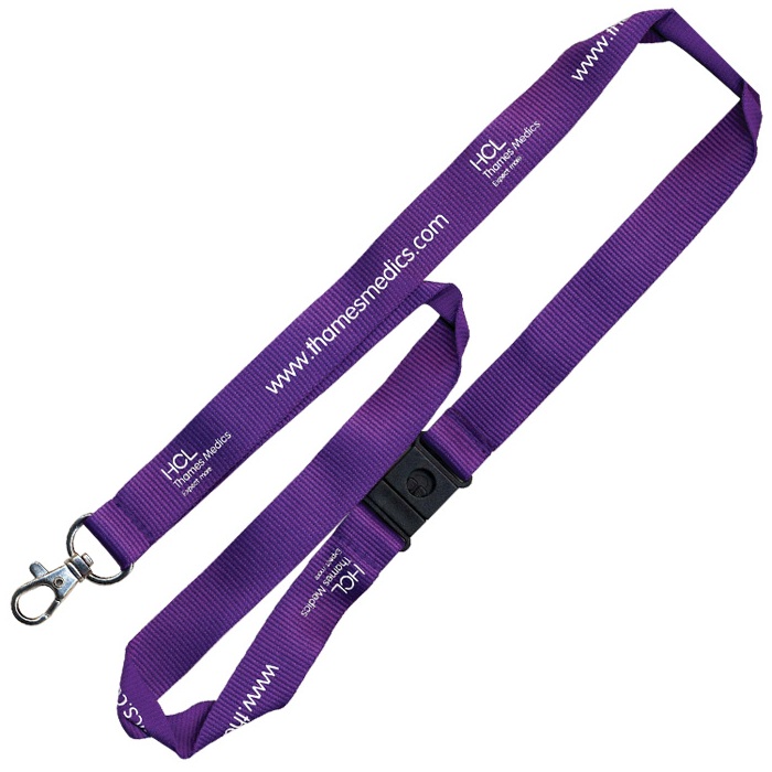 20mm flat polyester lanyard. Available in over 40 standard colours or Pantone matched for an additional charge. Price includes a 1 colour print on 1 side with metal trigger clip and safety break. Various other sizes, print options and fittings are available on request.