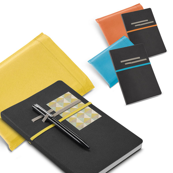 Imitation leather notebook with elastic pen / business card holder on front. With 96 plain sheets. Supplied in non-woven pouch. (ballpen shown in images not included).