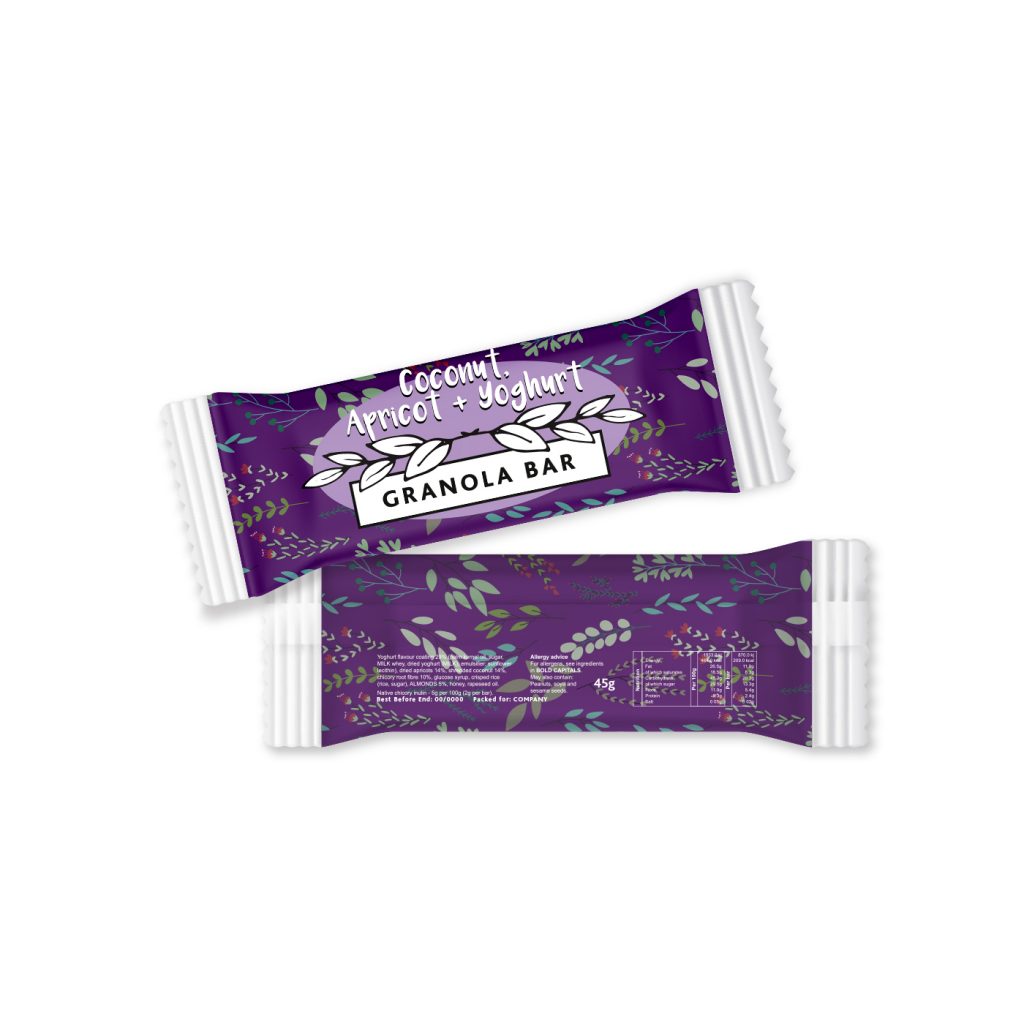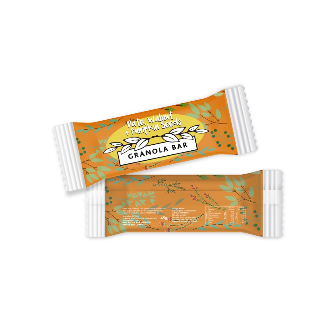 Flow wrapped Granola bar branded with a full colour digital print to the film. 45g. Choice of flavours: - Cashew, Blueberry & Yoghurt/Date, Walnut & Pumpkin Seeds/Peanut, Almond & Walnut/Coconut, Apricot & Yoghurt/Cocoa & Ginger
