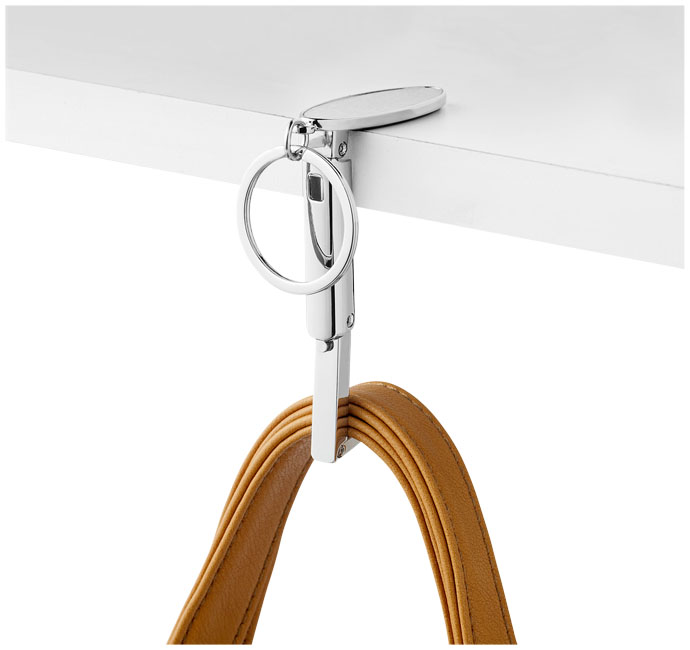Key chain with bag hanger which keeps bag clean and safe. Hanger can be attached on the edge of surface and can hold up to 2.5 kg. Metal split key ring. Metal