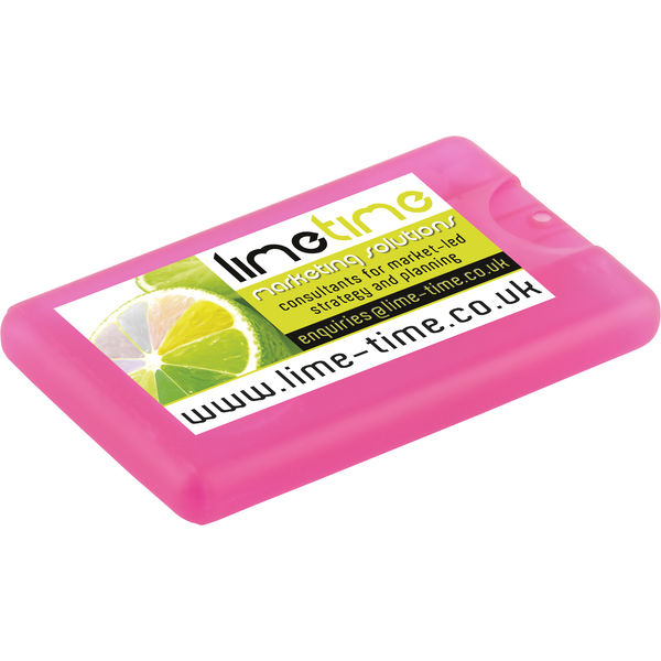 Credit card size hand sanitiser with spray action. Printed with spot colour print and fully compliant to British Standards EN 1276. Full colour printing is available at an extra cost.