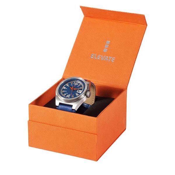 Carleton watch. Exclusive design. This watch has a date function and can be engraved to the back of the case. Includes batteries. Packed in an Elevate gift box. Metal and genuine leather.