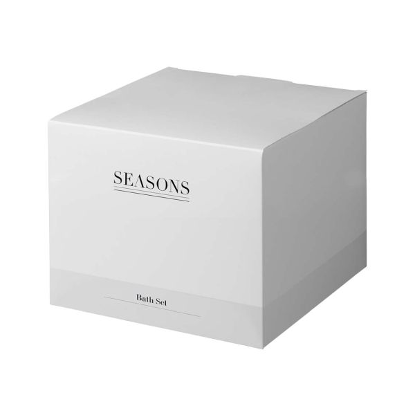 Kensignton bath set. This exclusive pouch includes a wooden massage tool, 20g puff, a candle and an organza bag with satin ribbon detail which holds a 100 gram soap bar. Fragrance of the soap bar is soft white cotton. Presented in a Seasons gift box. Cotton canvas and wood.