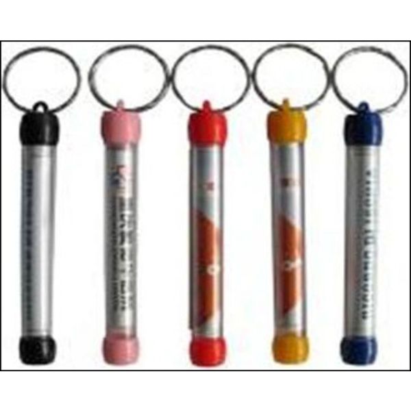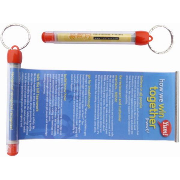 Banner keyring with retractable paper banner. Full colour print to both sides of the banner and both sides can have a different design. Large choice of stock colours available. Typical size of the banner 180 x 68mm.