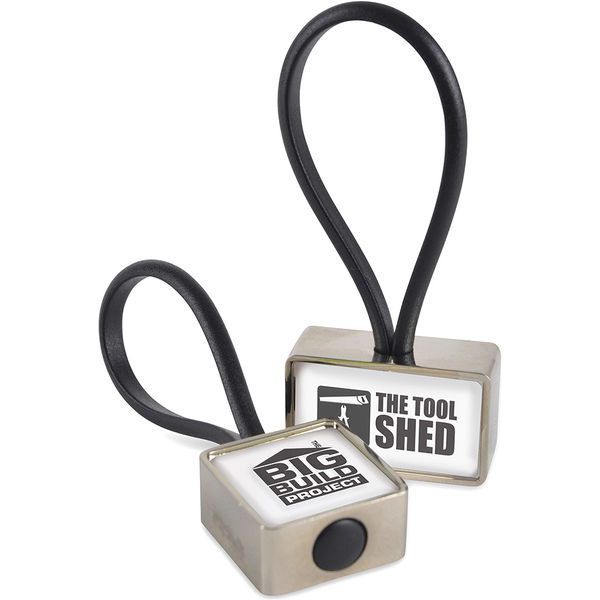 Metal block keyring with black rubber loop to attach your keys. Available in square or rectangle.