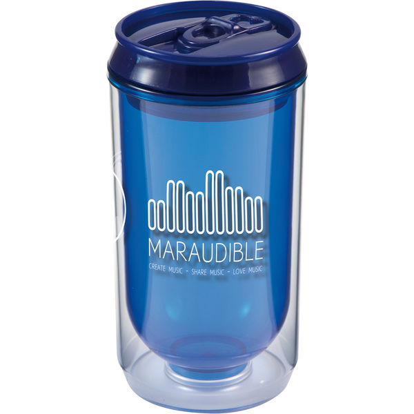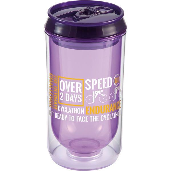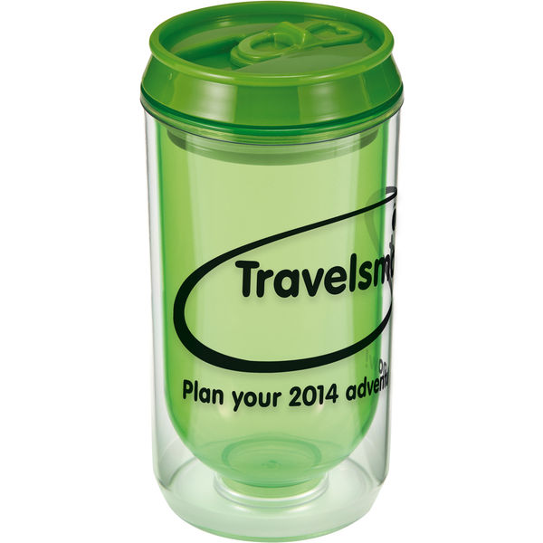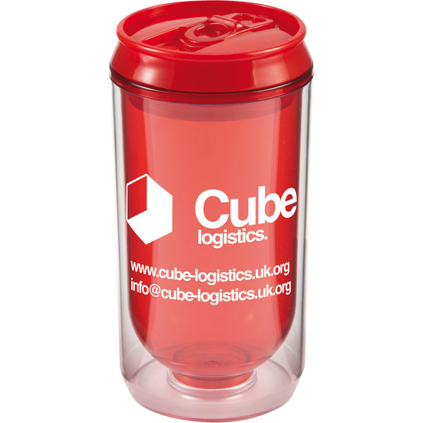 Modern and eye-catching way to promote your brand. This funky item is styled to look like a fizzy drinks can, with a sliding closure mechanism on the lid. It's double walled design has a clear outer layer and a translucent inner layer. 330ml capacity.