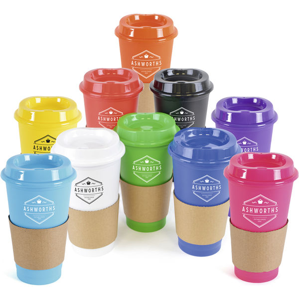 500ml coffee mug. Coloured lid matches the mug and it comes with a brown paper sleeve for grip and protection when holding. Conforms to articles in contact with food testing.