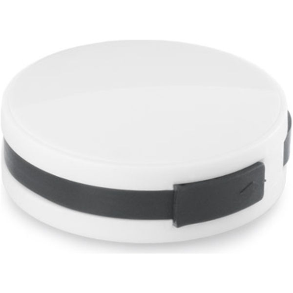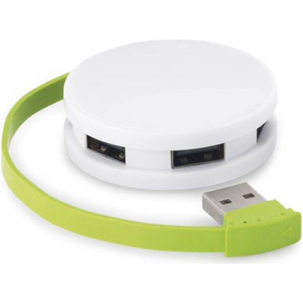 USB 2.0 hub. ABS. 4-port. Handy round container with 4 ports and cable tidy. White with assorted coloured cables.