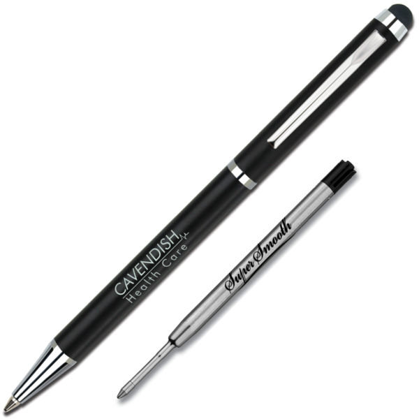A high quality slimline ballpen in matt black, gloss white or gloss midnight blue lacquer with bright chrome fittings and a high quality German made Parker style refill.