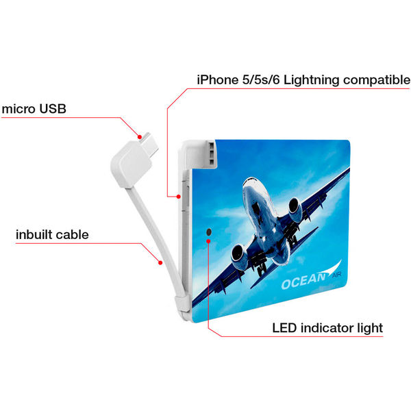 Super ultra slim card design is flat in your pocket and even fits your wallet. Capacity 2400mAh. Full colour print available on both sides. Li-Polymer battery. Input: DC 5V / 1A, output DC5V / 1A. Charging time approximately 3 hours. Battery life < 500 times. Free 1 year warranty. Available in white. Bespoke colours on request. Choose your own cable from 1,000 pieces. Additional features: built-in cable, LED indicator light, micro USB charging cable and Apple 5 / 6 adapter. Also available with a powerfull 4000 mAh battery -please enquire.