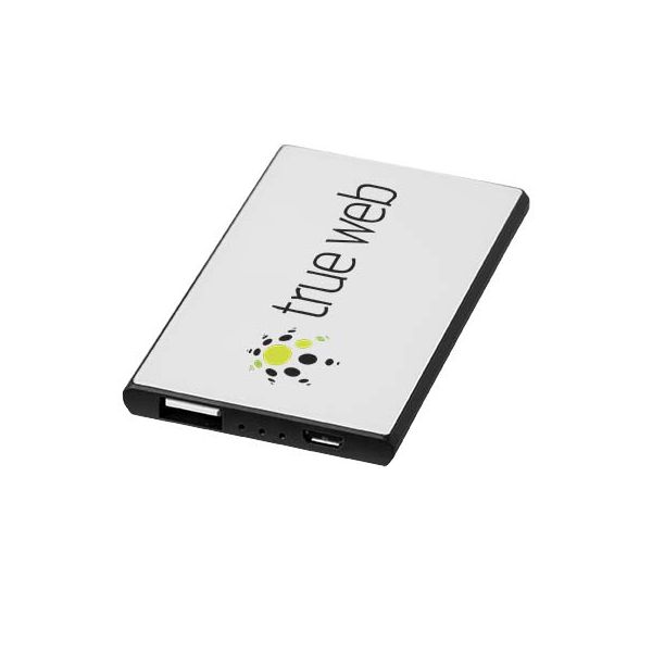 Slim credit card power bank 2000 mAh. The 2000 mAh rechargeable lithium polymer Grade A battery is enough to charge smartphones, MP3 players and more. Perfect size for your pocket, wallet or bag. Reusable power bank charges via USB cable (included). Input: 5V/500mA. Output: 5V/1000mA. Packed in a white carton box. ABS.