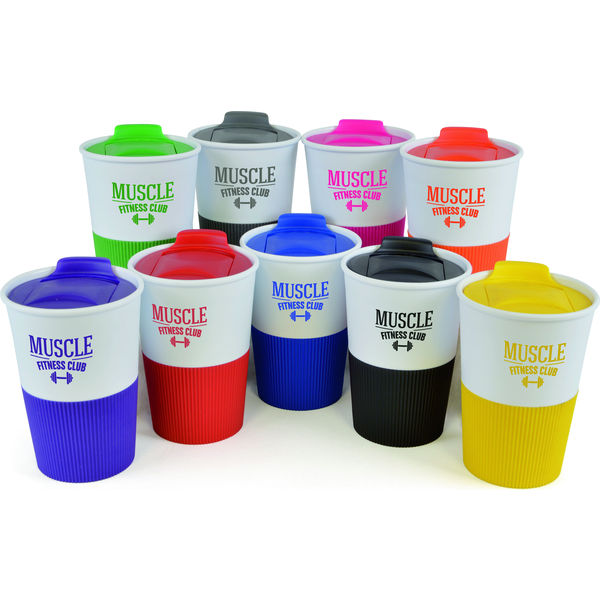 350ml double walled shiny plastic take out coffee cup with rubber base and matching lid.