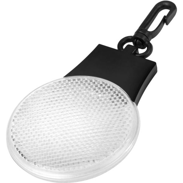 Three LED light settings (solid, blinking and flashing left to right). aPress on/off power button and function switch on back. A plastic hanging clip. Batteries included. ABS plastic with PS plastic reflector