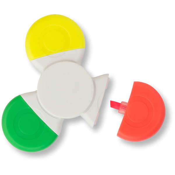 A great desk accessory - fun, stress relieving and useful. Three colours of highligher plus a fidget spinner.