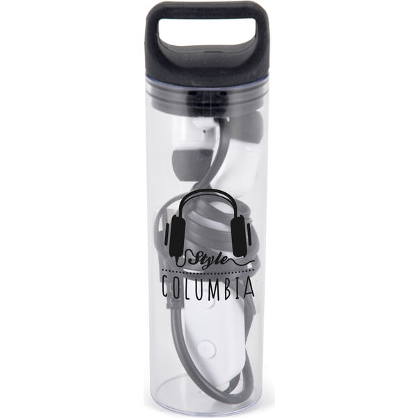 Black and white wireless bluetooth earphones stored in a clear plastic cylinder and sealed with a black stopper. Bluetooth connects to your device, allowing you to listen to music without wires getting tangled. Integrated volume controls and microphone. Earphones charge via USB port.