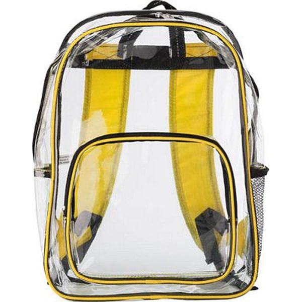 Transparent PVC backpack with coloured piping, front zipped pocket, large zipped main compartment, one mesh side pocket and adjustable shoulder straps.