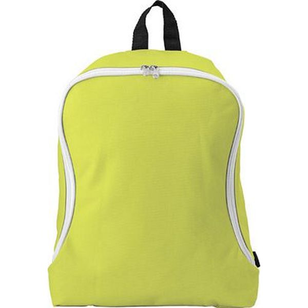 Polyester backpack with a zipped large compartment, a nylon carrying loop and two adjustable carry straps.