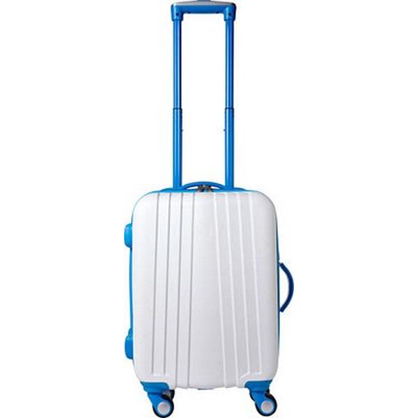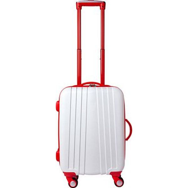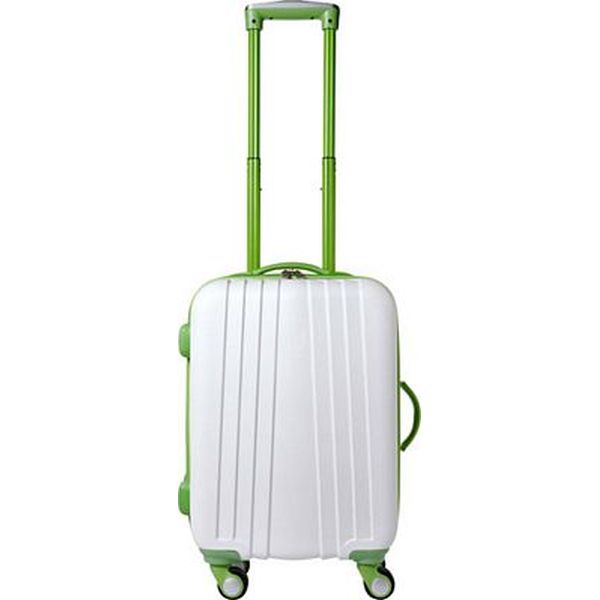ABS trolley with 4 spinner wheels, a coloured extendable metal handle, matching metal zip and parts and a metal lock.