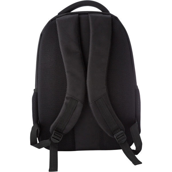 Polyester, 1680D backpack with padded main compartment for a laptop, a front zipped pocked and adjustable shoulder strap.
