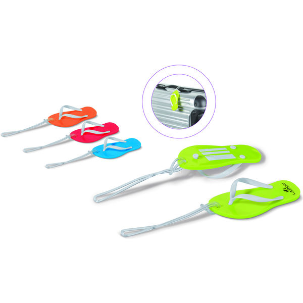 Luggage tag in the shape of sun slippers. This luggage tag makes the sun already shine on your holiday destination! Another advantage is that you can easily find your luggage due to the special shape of the tag.