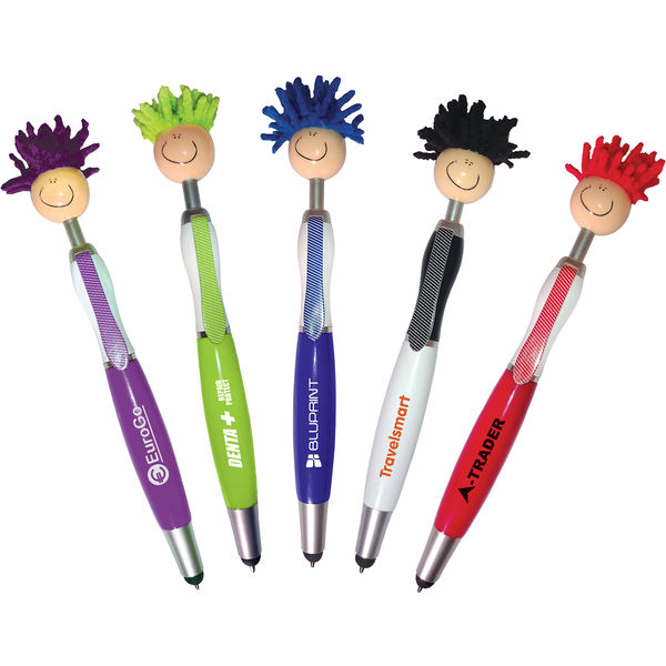 The Mop Head Pen is a fun and functional way to promote your company. This quirky looking pen boasts a host of fantastic features; the hair works as a screen cleaner and the base of the pen has a soft-feel stylus tip, making it a great choice for users of mobile devices. The bottom part of the barrel is available in a brilliant range of colours and the clip is designed to look like a striped tie in matching colours. Supplied with black ink.