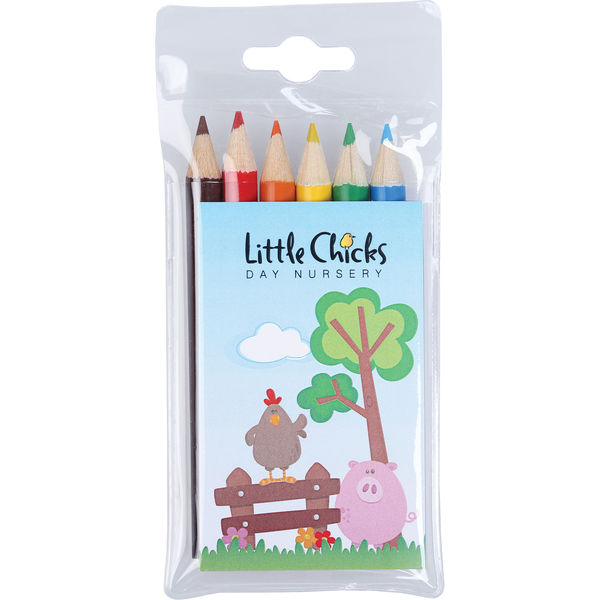 6 half length colouring pencils in a handy size clear acetate pouch with your artwork printed in full colour on insert. Pencil size 85mm long. Assorted colours.