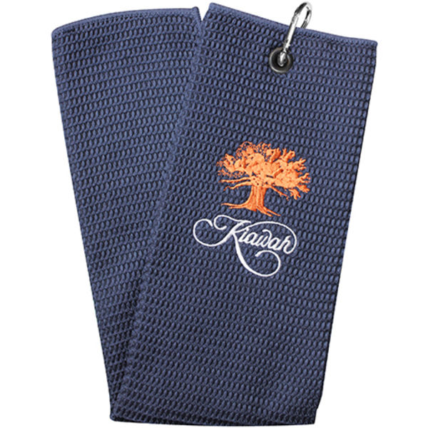 A white microfibre towel with the same waffle weave is now able to be printed in full colour print to 1 side. Now available in 18 great colour options. Folded and held in place with a carabiner hook which attaches to the bag.