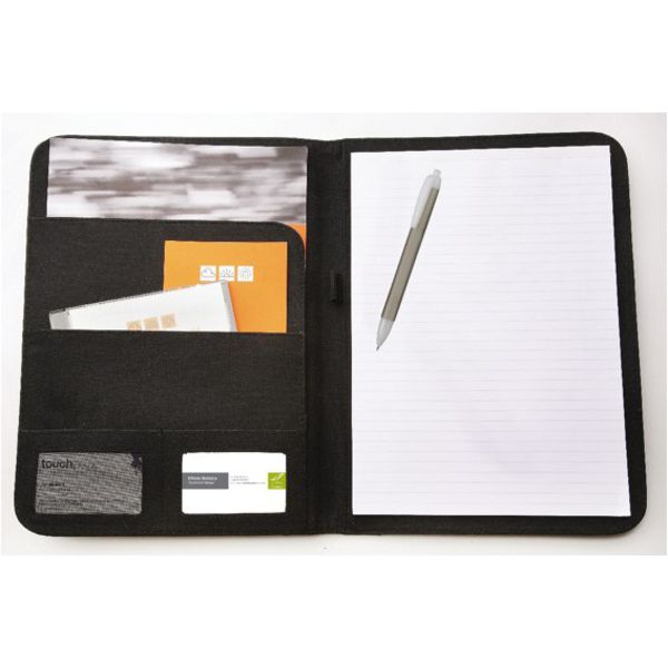 Smart well made and cost effective tactile black PU folder with stylish nylon trim. Supplied with both pen and pad.
