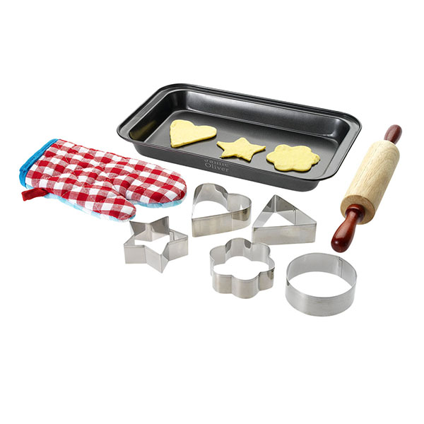 Biscuits and brownie set. Ideal gift for fun family baking. This set includes 5 cookie cutters, a baking tray, a rolling pin and an oven glove. Supplied in a Jamie Oliver gift box. Exclusive design. Metal, wood, cotton and non-stick coated metal. Laser engraved on the baking tray or rolling pin.