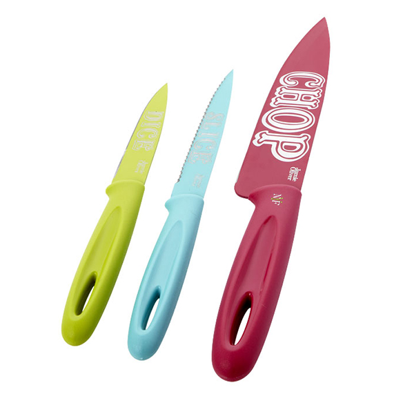 Funky Knife Set. Set includes 15cm chef's knife, 11cm serrated knife and 8.5cm paring knife. Durable non-stick coating, dishwasher safe. Supplied in a Jamie Oliver gift box. Exclusive design. Stainless steel.