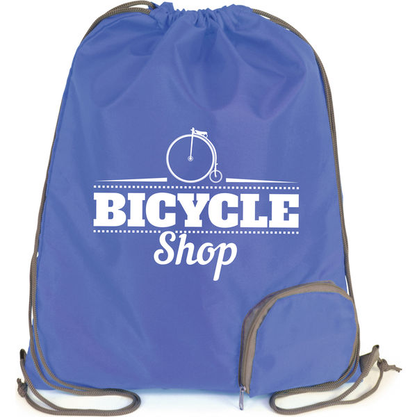 210D Polyester large drawstring bag which handily folds in the corner of the bag and sealed with a zip. Grey drawstring and grey trim to zipped pocket.