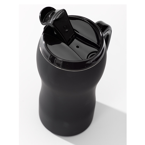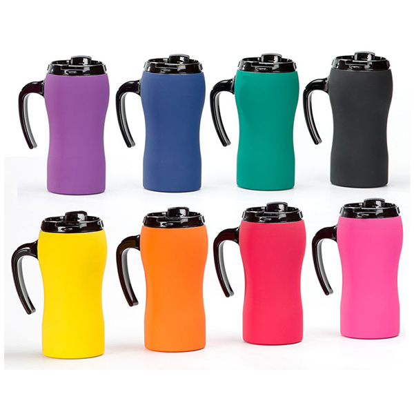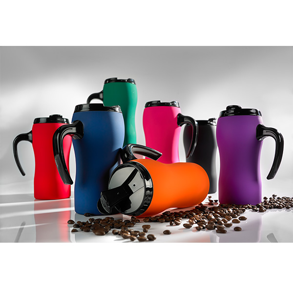 Leakproof thermal mug is made of aluminum. It has a double wall to keep heat. It is covered with a nice touch rubberized surface so it does not slip from your hand. Available in 8 colours. It is certified for food contact. Capacity: 450 ml