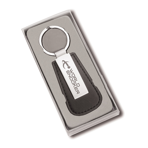 Leather Premium Sapporo keyring in black, dark blue, racing green or dark brown genuine leather with a satin chrome metal plate and a flat split ring fitting. Supplied in a silver card gift box.