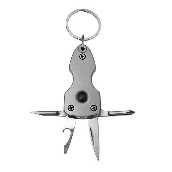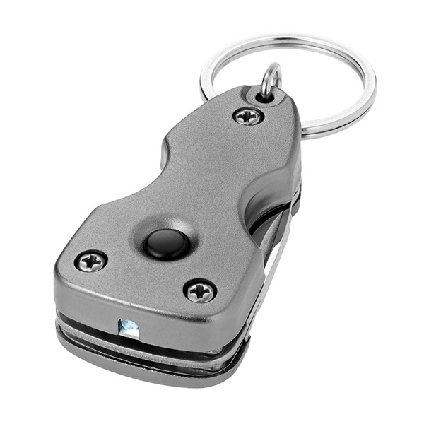 Compact 7-function tool with bright LED light, on/off power switch and metal split keyring. Battery included. Aluminium
