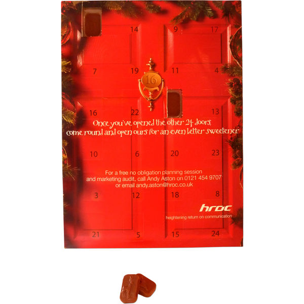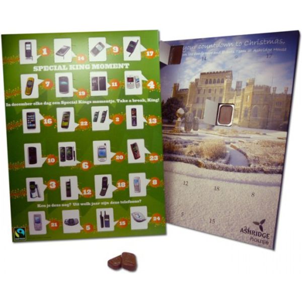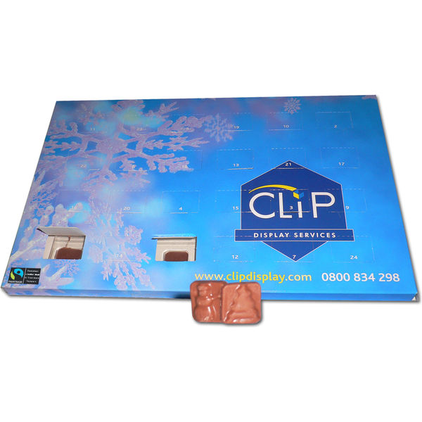 24 milk chocolates in a traditionally sized Advent Calendar. Printed full colour on all sides to customers own design, or chose from the off the shelf range that can be branded with a logo an seasonal greeting A Desktop Advent Calendar (with fold out stand) is also available. All our Advent calendars are made with high quality board and shrink wrapped as standard to ensure food safety and retail quality. Mailing cartons are available at additional cost.