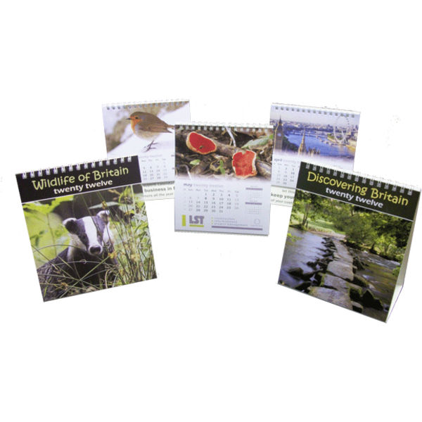 Customised or fully bespoke compact desk calendar - 138mm x 160mm. Wire bound on short edge with card easel. Images can be supplied or use our stock images if required. Advert can be printed on the leaves or easel. Please enquire