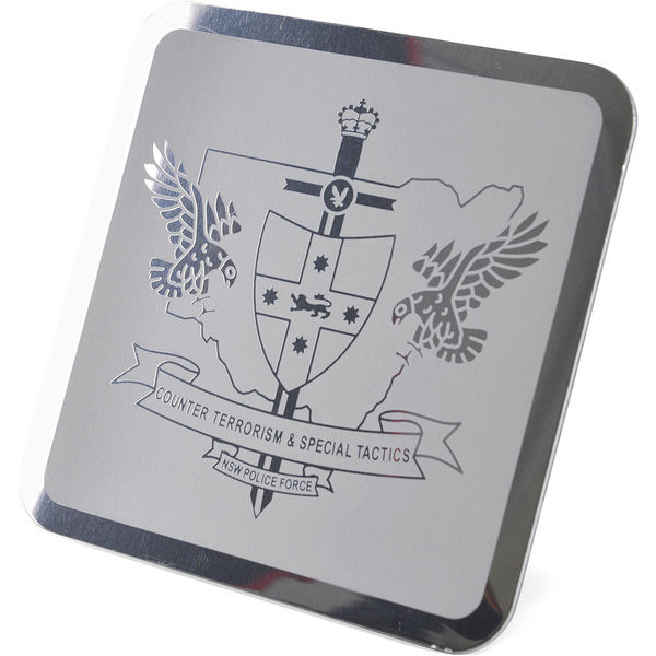 Square shaped silver metal coaster with anti slip block backing.