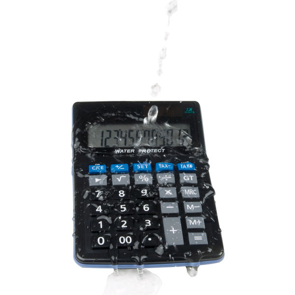 Dual-power calculator with big keys and 12 digits. The calculator can be easily cleaned under running water, therefore is ideal for mechanics, butchers, etc.