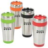 Double walled mug with twist-on thumb slide lid. Volume capacity is 470ml. Stainless steel exterior, plastic interior.