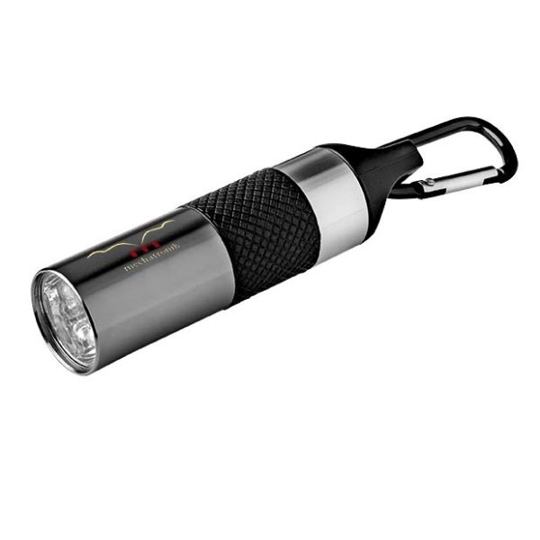 Omega torch and bottle opener. 6 white LED torch with twist off bottle opener and carabiner. Batteries included. Aluminium.
