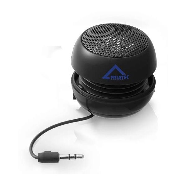 Ripple speaker. Expanding speaker to boost sound with an internal rechargeable battery providing up to 2 hours playback time. Connect the speaker to any smartphone, tablet or audio device using the built-in 3.5mm audio jack. Includes USB charging cable and white carton box. ABS plastic.