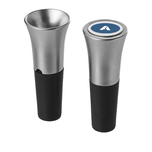 Flow 2pc wine set. Exclusive design wine pouring spout and stopper set. The pourer ensures controlled, non-drip dispensing and the stopper eliminates waste by preserving the flavour of previously opened bottles of wine. Presented in an Avenue gift box. Metal.