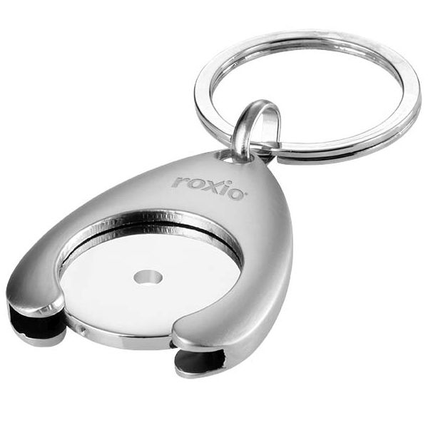 Trolley Coin Holder Key Chain. 1 Euro sized coin with à 6mm hole and holder. Ideal when searching for a coin for a supermarket shopping trolley. Packed in black gift box. Metal.