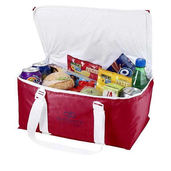 Large cool bag suitable for up to 12 cans. The strap can be used to carry a towel. Velcro® closure on main compartment and webbing carry handle. 70D Polyester.