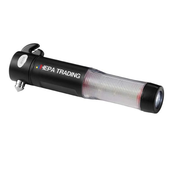 Multifunction car emergency torch. Illuminates up to 200m. Includes window hammer, safety belt cutter, and built-in magnet for attaching to vehicles. Lasts up to 36 hours when used as a torch (using one super bright LED) or up to 48 hours when used to flash red emergency signal (using 9 LEDs). Packed in a STAC gift box. Batteries included and inserted. Exclusive design. ABS plastic.