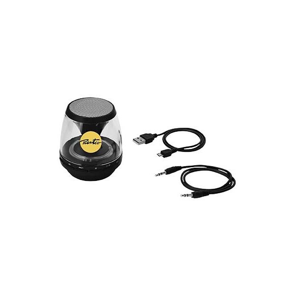 Rave light-up Bluetooth® speaker. LED Light up portable Bluetooth® speaker with internal rechargeable battery which provides playing time up to 4 hours. Speaker illuminates in seven colours of Red, Green, Blue, Pink, Orange, Yellow, Purple while playing music. Speaker can be synced by Bluetooth® or connected with a 3.5mm audio cable. Audio and charging cables included. Packed in a white gift box. Plastic. 126.
