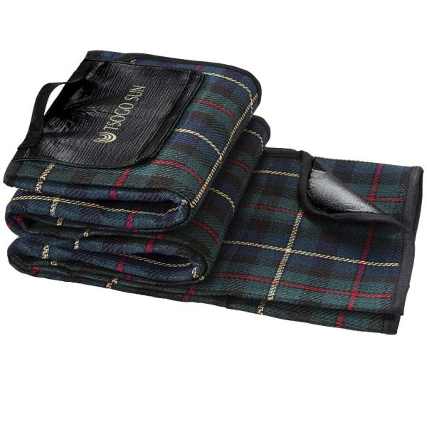 Park picnic blanket. Classic blanket with tartan pattern. The backing protects against water and dirt. The handle makes it easy to carry this blanket. Blanket size is 145 x 130 cm. Acrylic with water resistant backing.